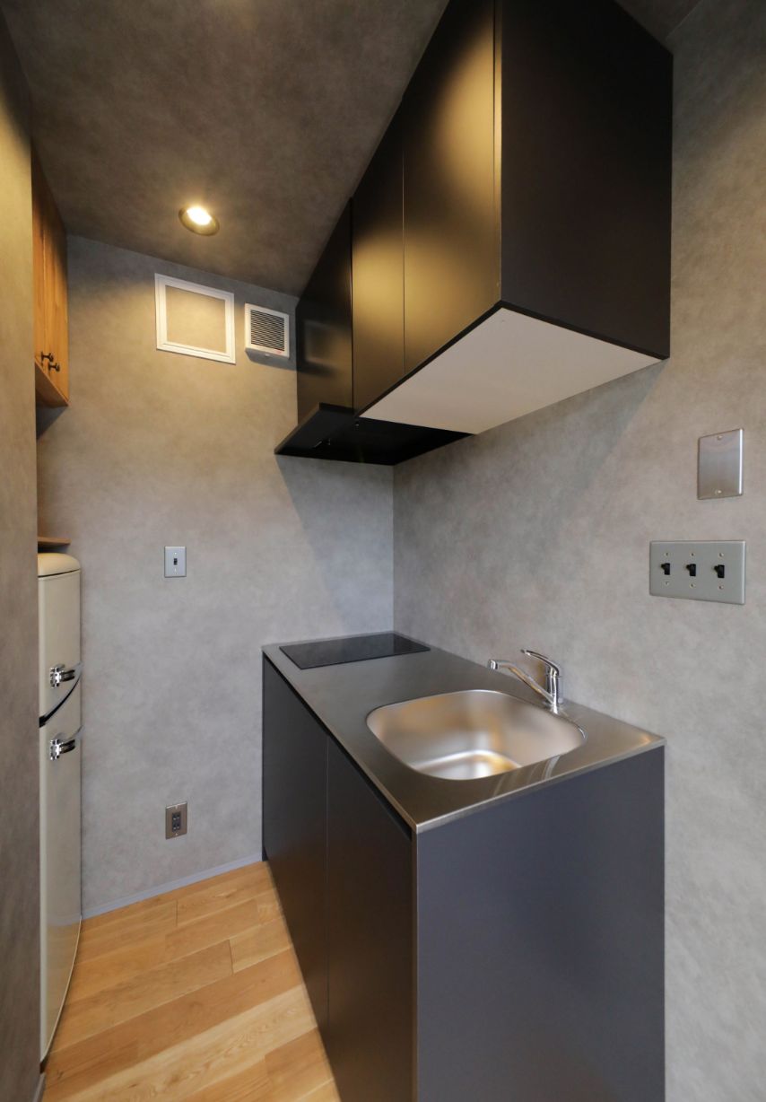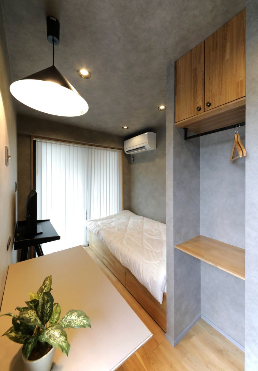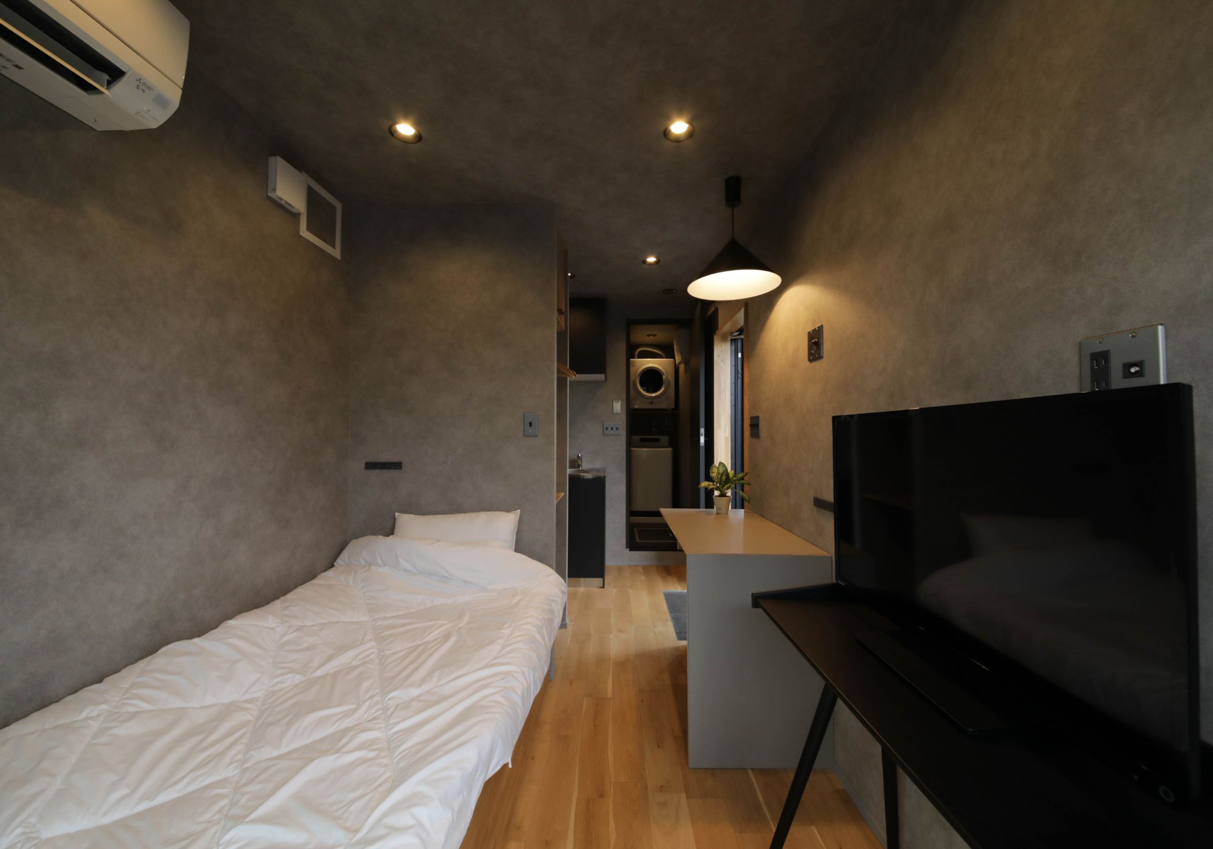 限られたスペースの中に、ベッドルーム・キッチン・脱衣所・3点ユニットバスを無理なく配置。生活に必要な機能がすべて揃った、居心地のよい一室です。