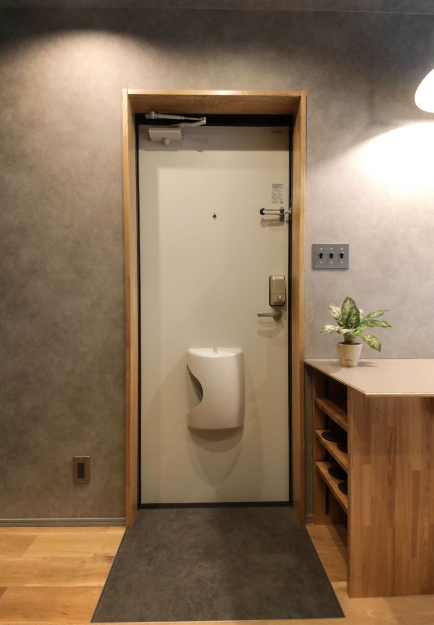 無垢のフローリングと、グレーの壁紙が織りなす落ち着いたトーン。そこにアメリカンスイッチやダウンライトが組み合わさることで、思わずここがコンテナだということを忘れてしまうほどの心地よさです。