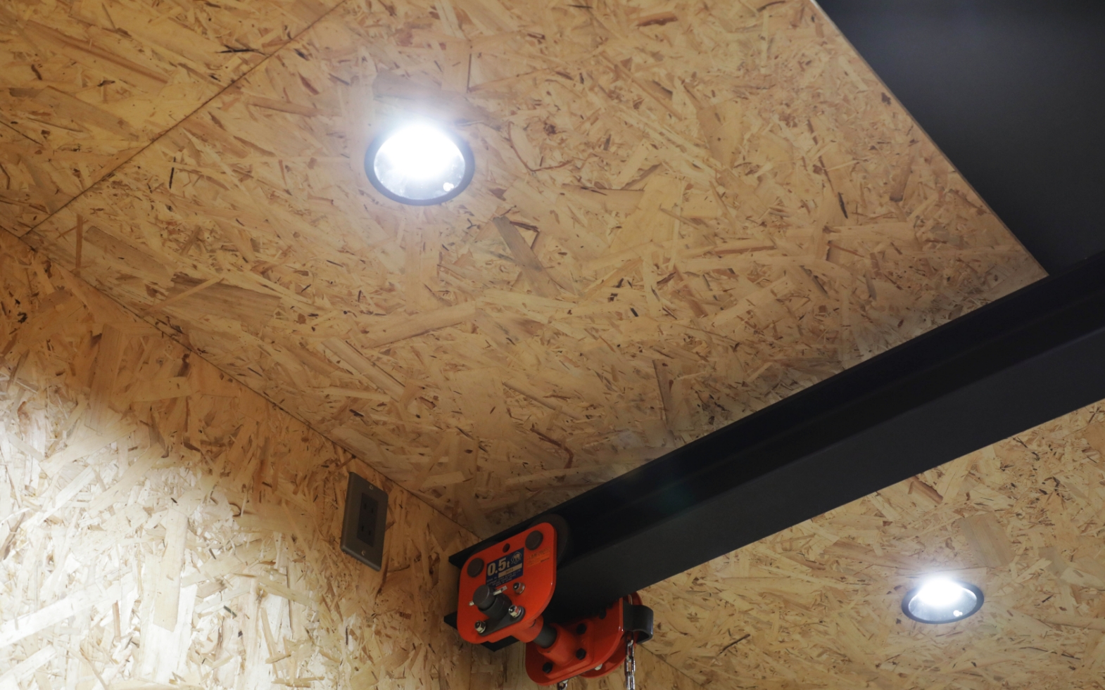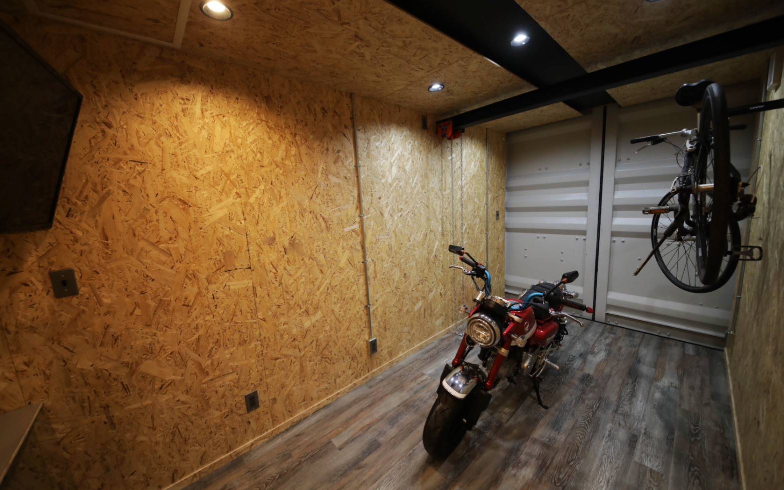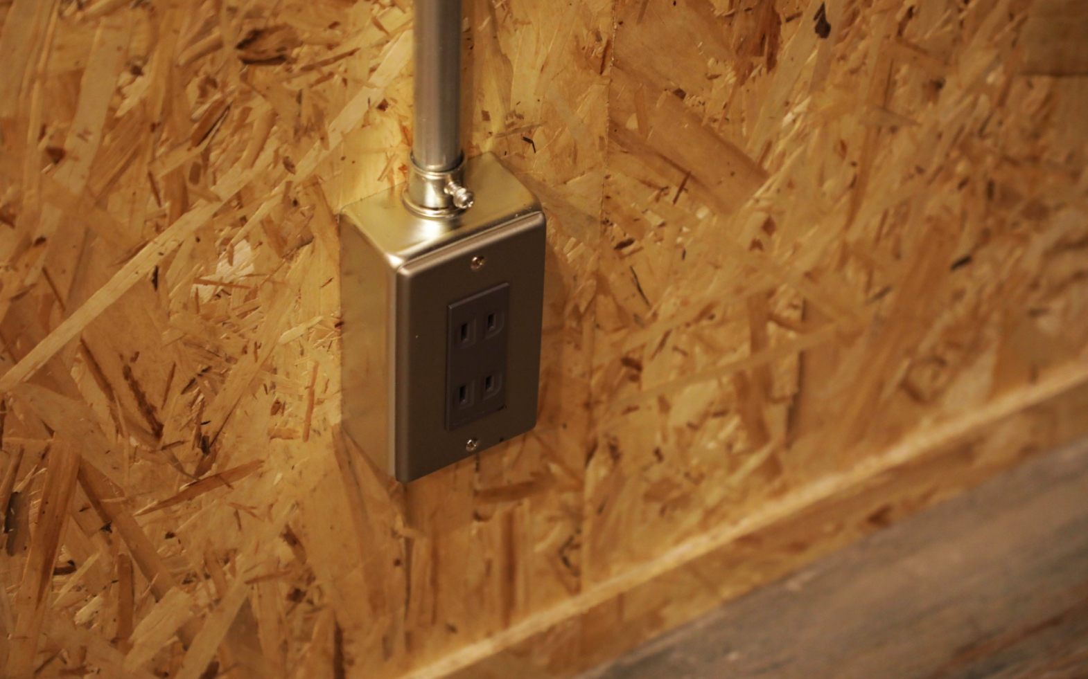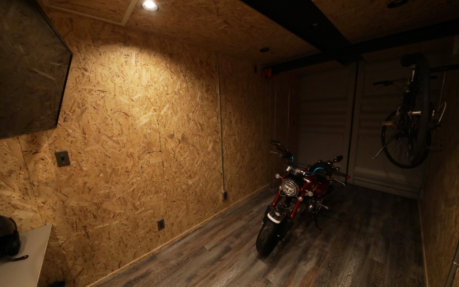 無垢のフローリングと、グレーの壁紙が織りなす落ち着いたトーン。そこにアメリカンスイッチやダウンライトが組み合わさることで、思わずここがコンテナだということを忘れてしまうほどの心地よさです。