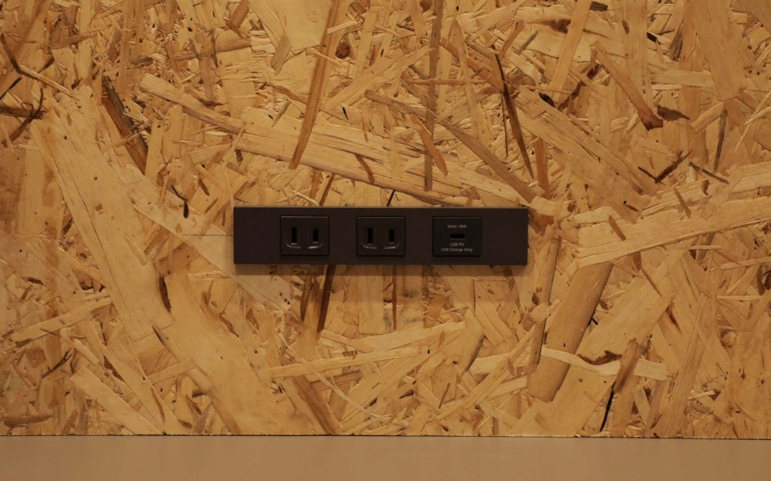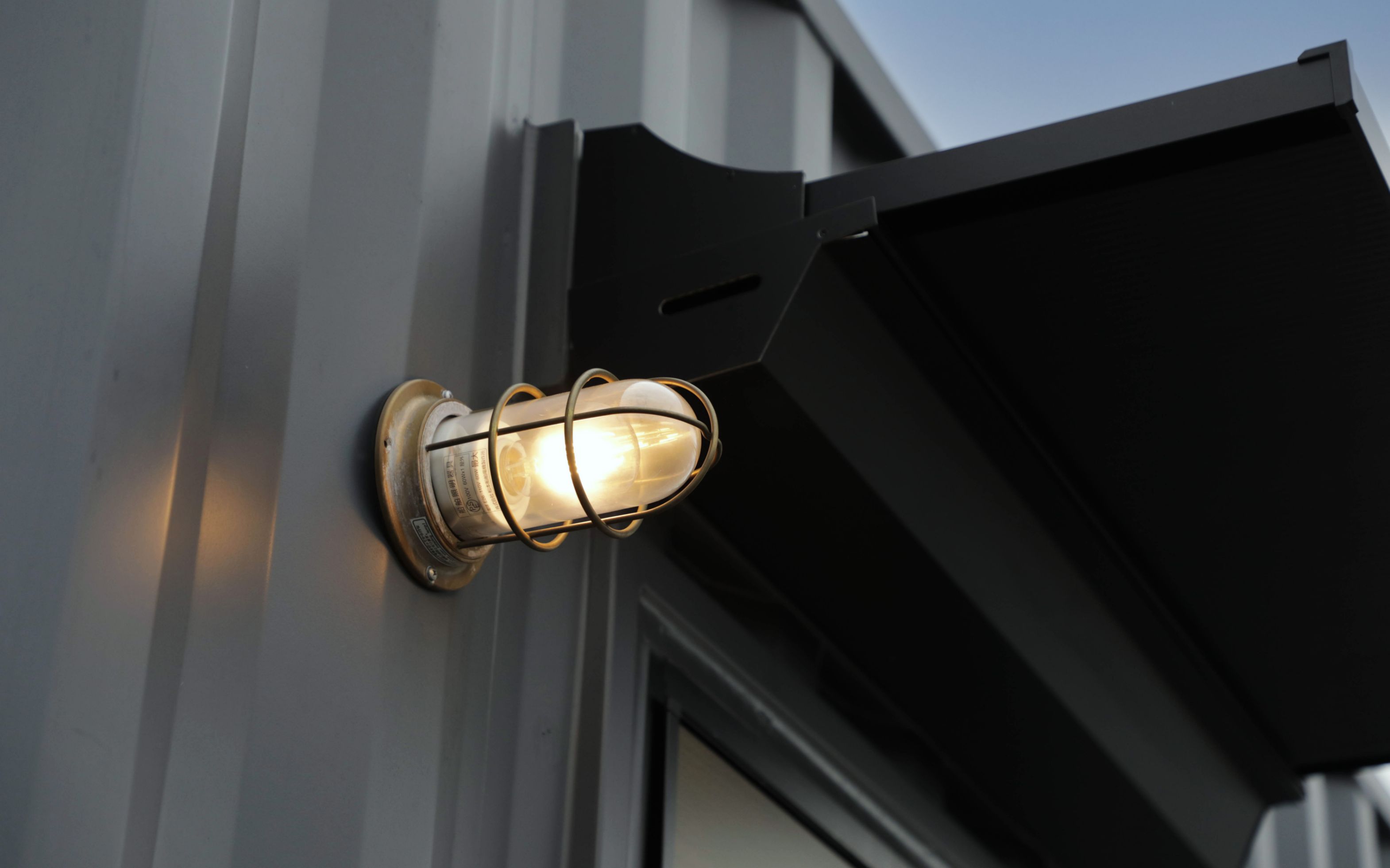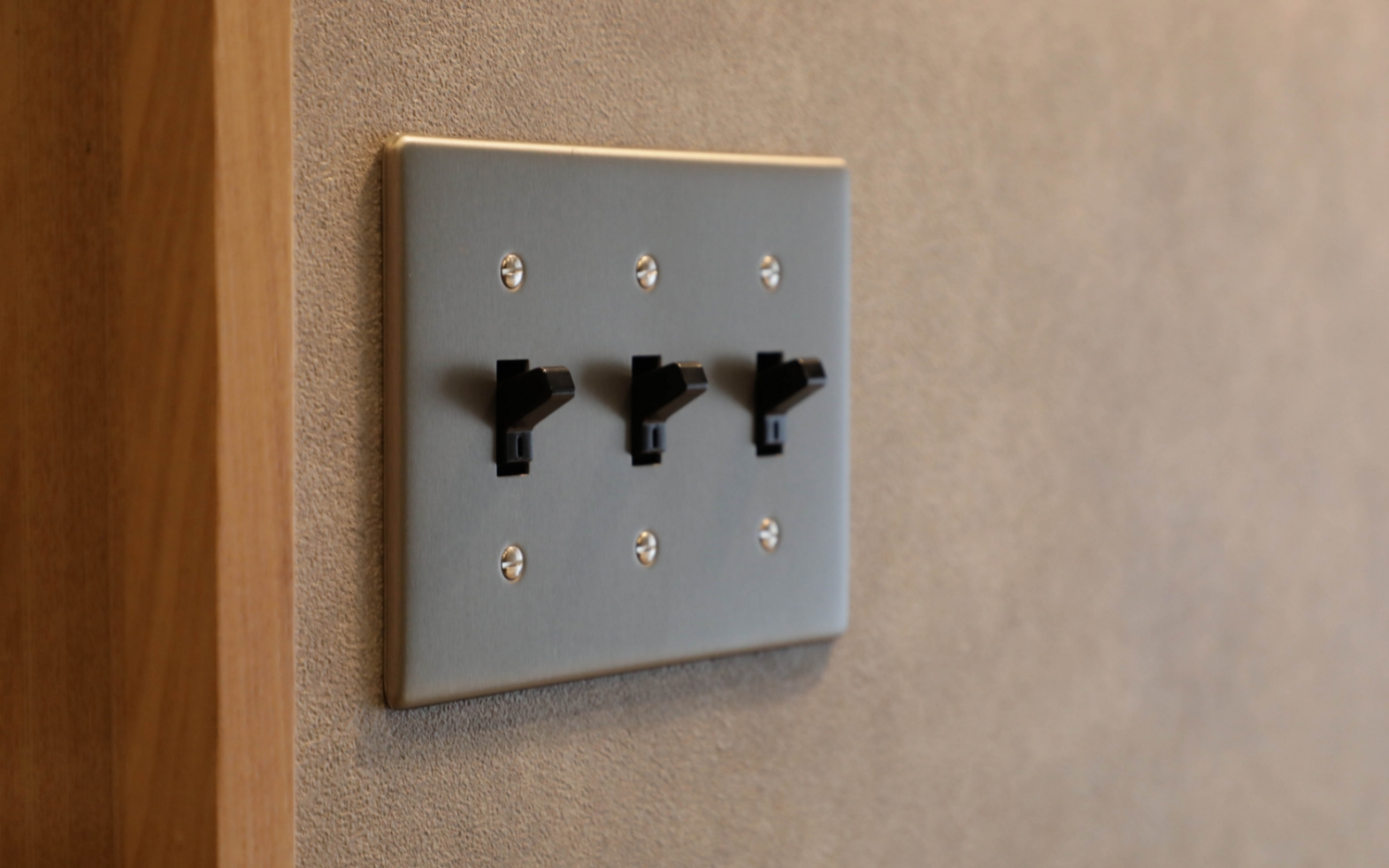 無垢のフローリングと、グレーの壁紙が織りなす落ち着いたトーン。そこにアメリカンスイッチやダウンライトが組み合わさることで、思わずここがコンテナだということを忘れてしまうほどの心地よさです。
