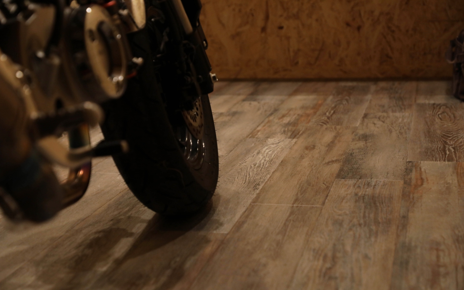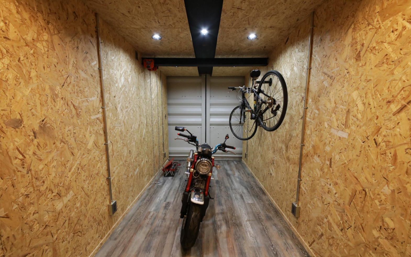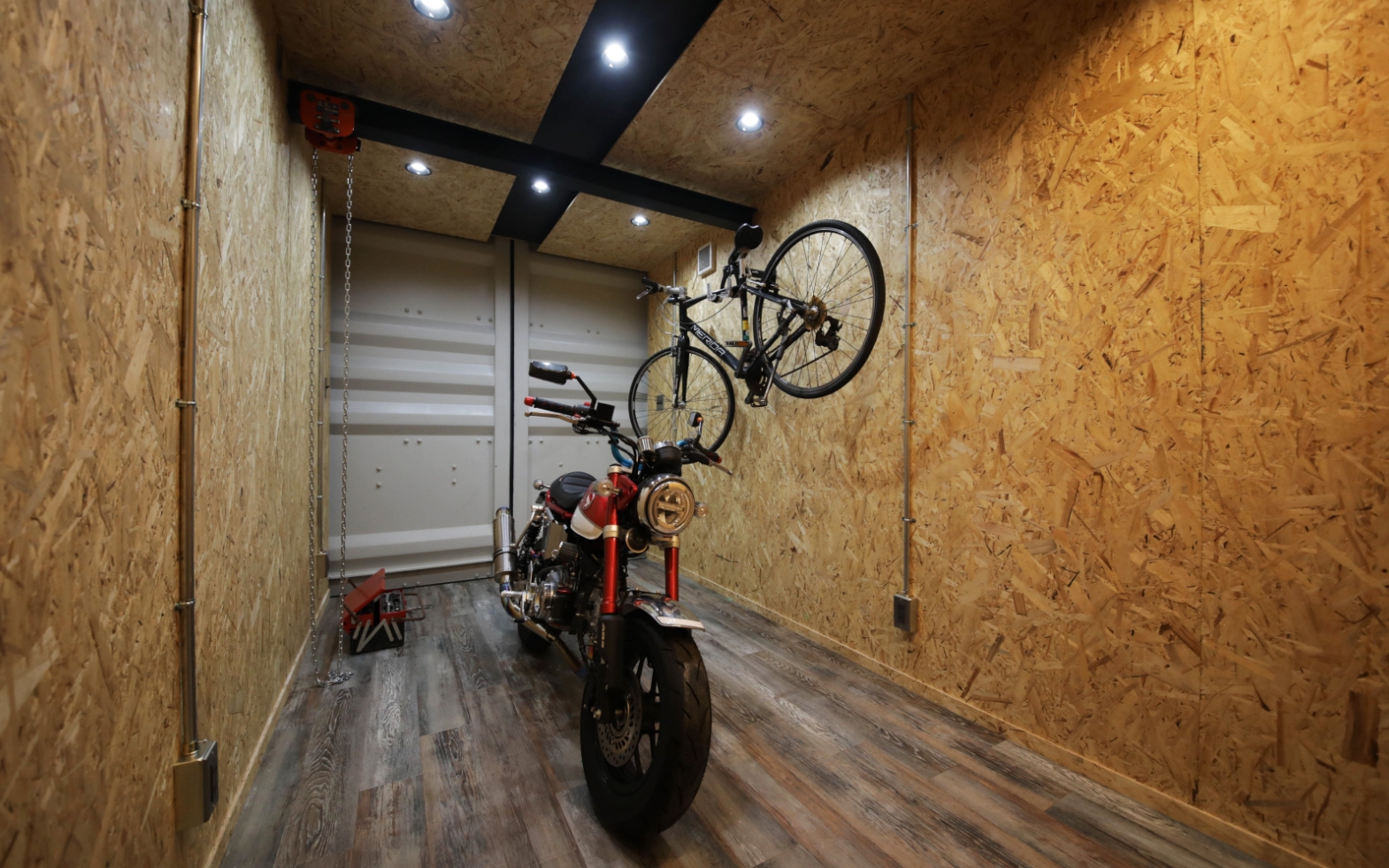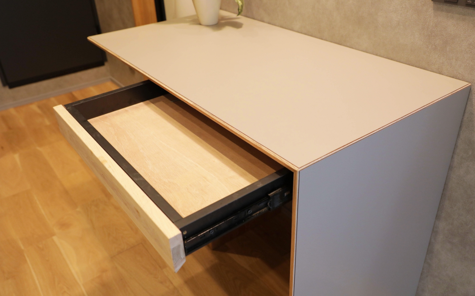 無垢のフローリングと、グレーの壁紙が織りなす落ち着いたトーン。そこにアメリカンスイッチやダウンライトが組み合わさることで、思わずここがコンテナだということを忘れてしまうほどの心地よさです。